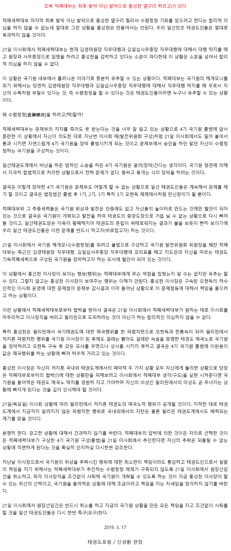 21일 이사회에서 지적한 대로 적폐세력이 국기원을 장악하는 것을 막는데