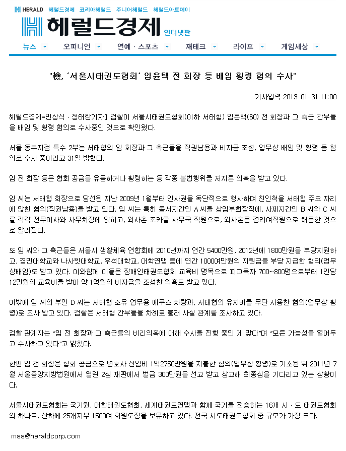 檢 서울시태권도협회 임윤택 전 회장 등 배임 횡령 혐의 수사 페이지 정보 금오 () 작성일2018-03-21 15:27 조회124,359회 댓글0건 본문 댓글목록 등록된 댓글이 없습니다. 목록